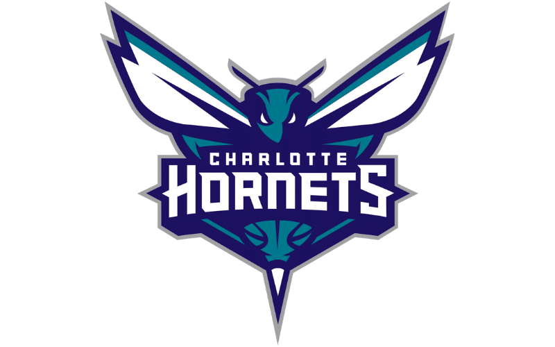 The team colors for the Charlotte Hornets, prominently featuring on their logo, include Hornets purple, teal, and gray.