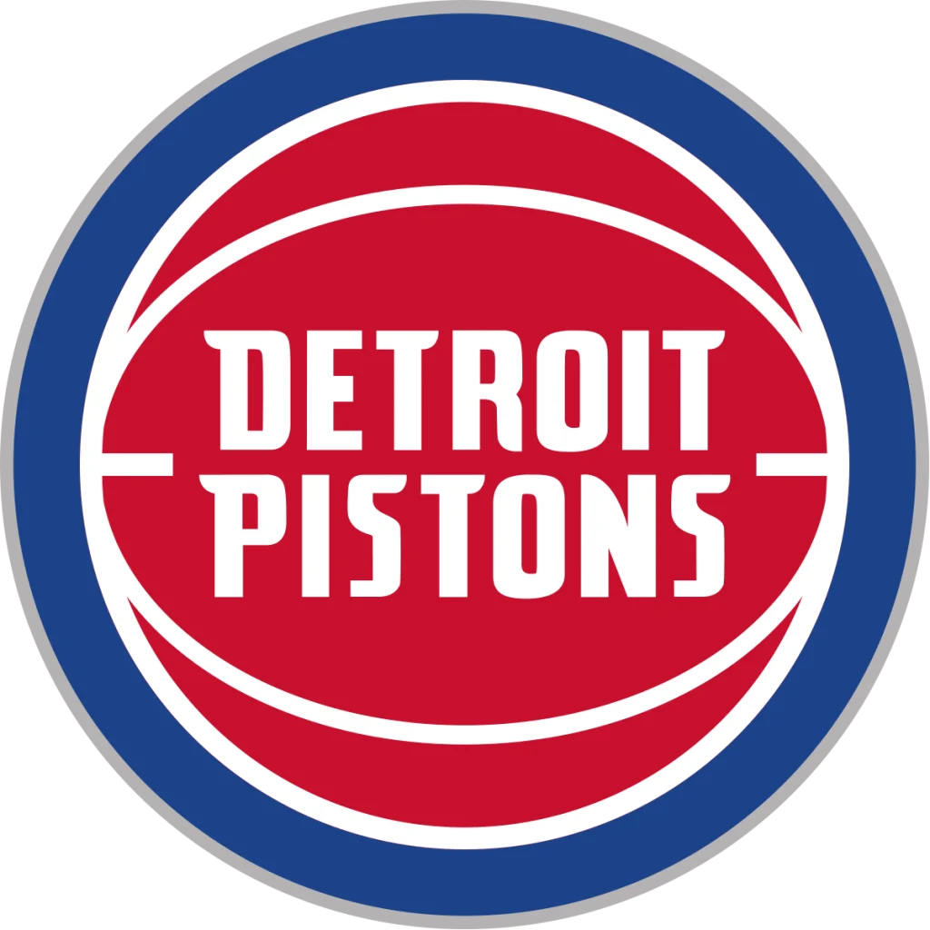 The team colors for Detroit Pistons are a bold combination of red, blue, gray, navy, and white, reflected in their dynamic logo design.