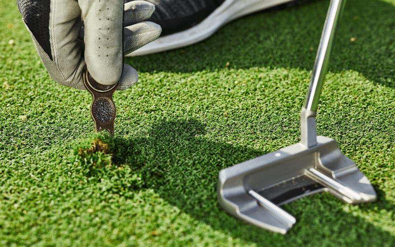 A divot repair tool is used to fix the turf on the green damaged by the golf ball’s impact. Keeping the course in good condition is important for playability and etiquette, and this tool helps in maintaining the greens.