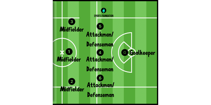 1,2,3–Midfielders 4,5,6–Attackman or Defenseman (as per game phase) G–Goalkeeper