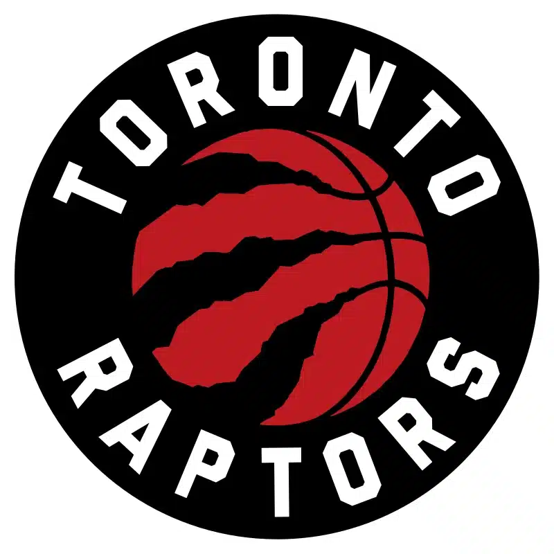 The team colors for the Toronto Raptors, prominently displayed on their logo, include a striking combination of red, black, silver, and gold.